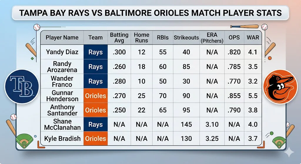 Here is a detailed look at how players perform. This table shows the Tampa Bay Rays vs Baltimore Orioles match player stats clearly. You can compare the best players from both teams side by side.